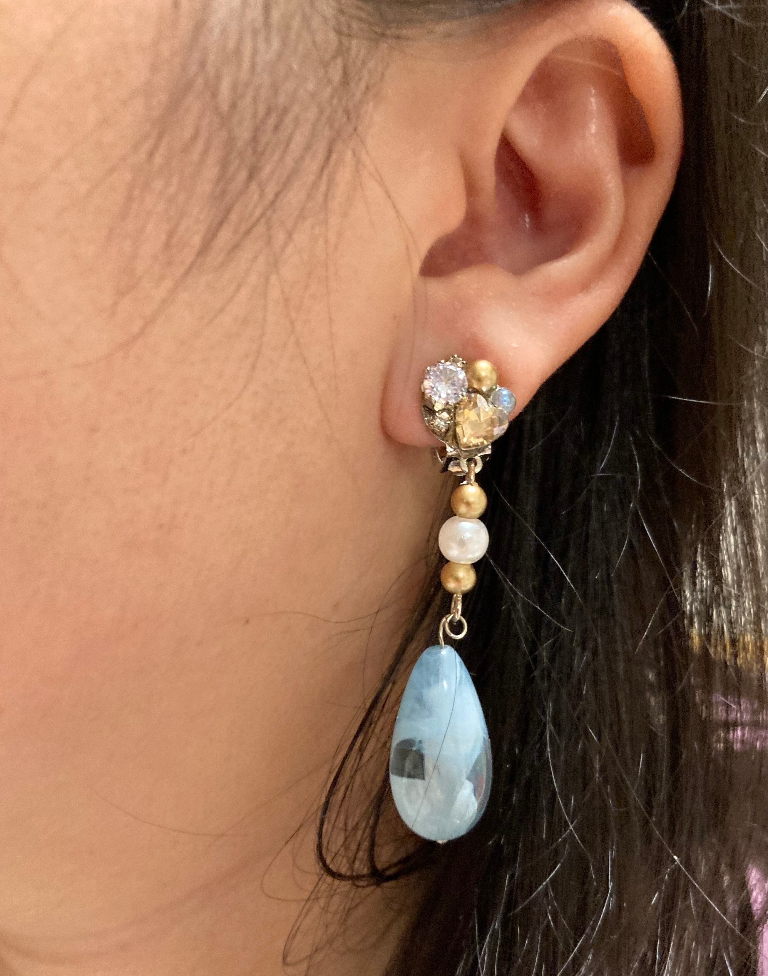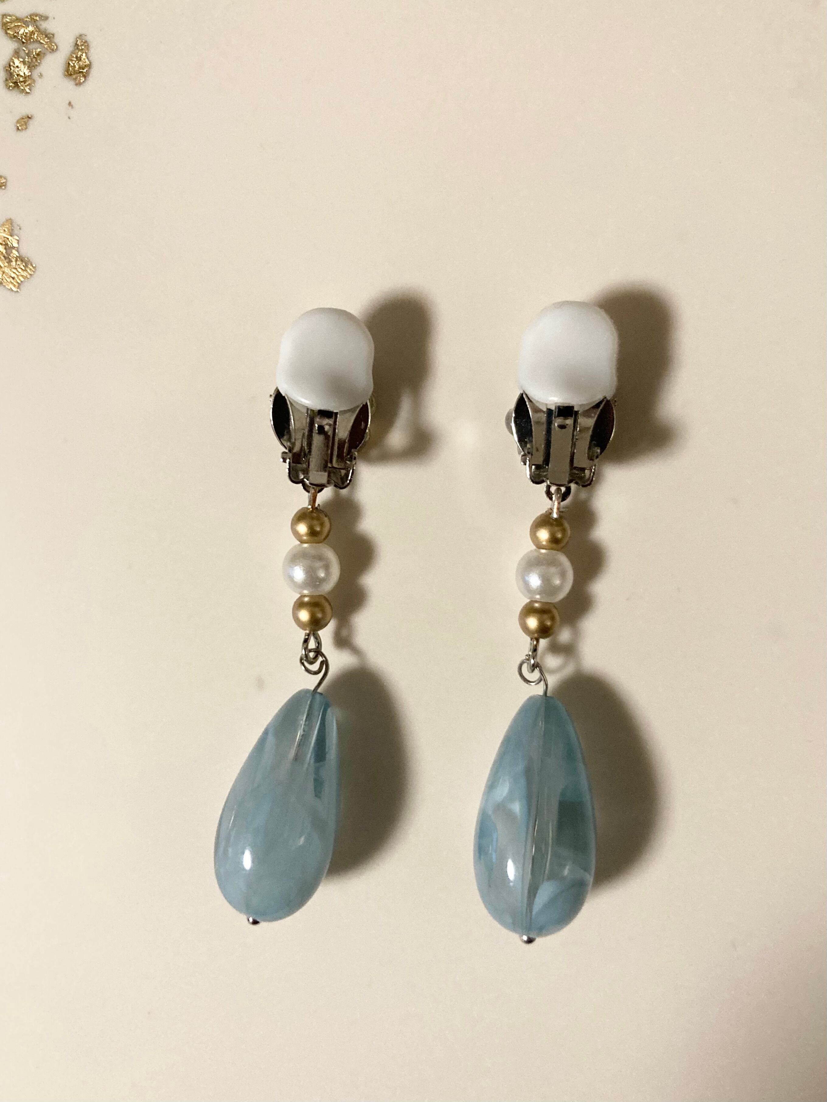 大きな水色のしずくが目を惹く華やかなイヤリングです。ゴールド、パール、ハートなど、ゴージャスなモチーフが盛りだくさん。