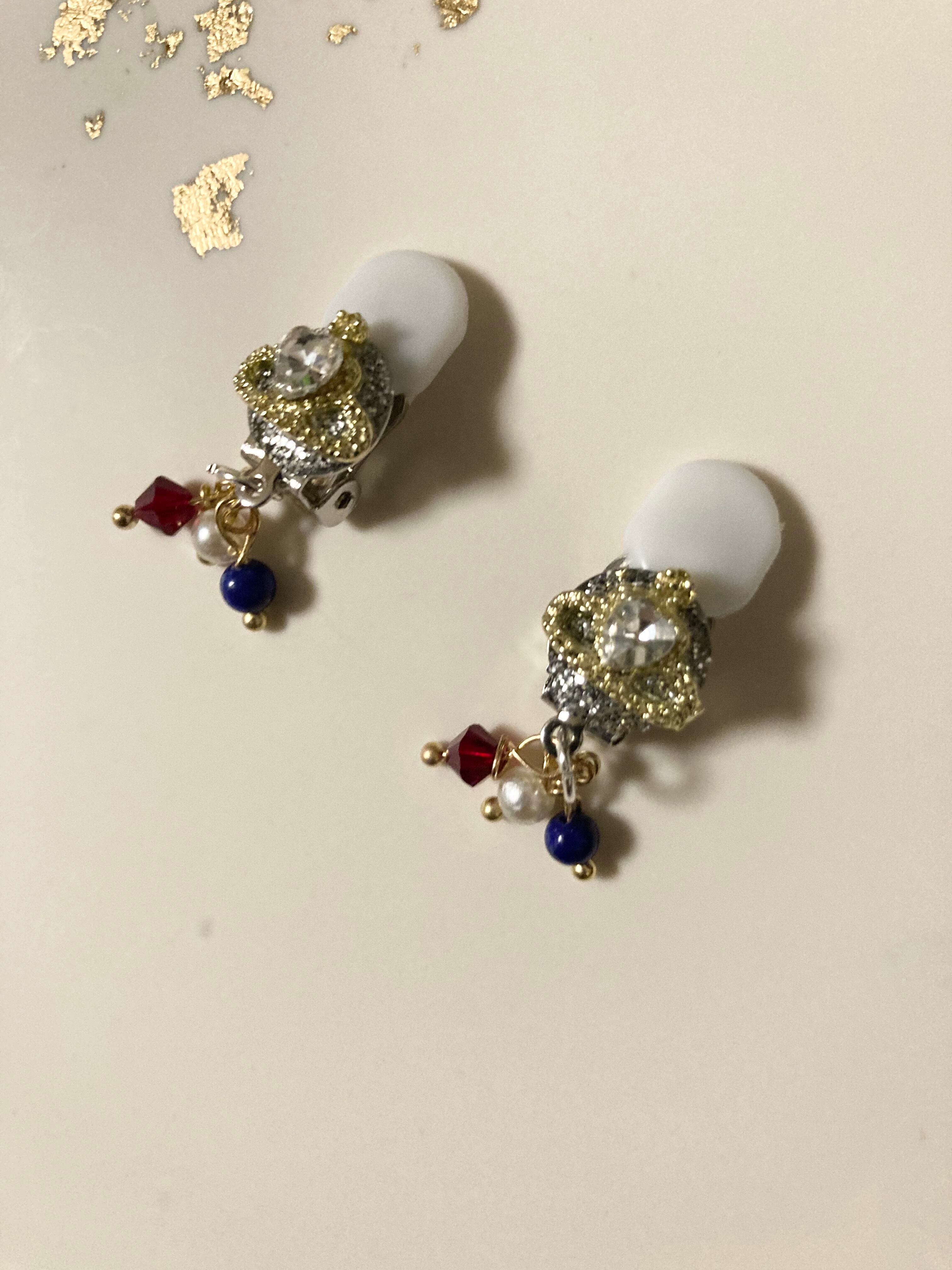 ティアラをモチーフにした小ぶりなイヤリングです。銀色の円の中でゴールドのティアラがキラキラと光ります。アクセントにはラピスラズリ、赤のガラスビーズ、パールを合わせました。