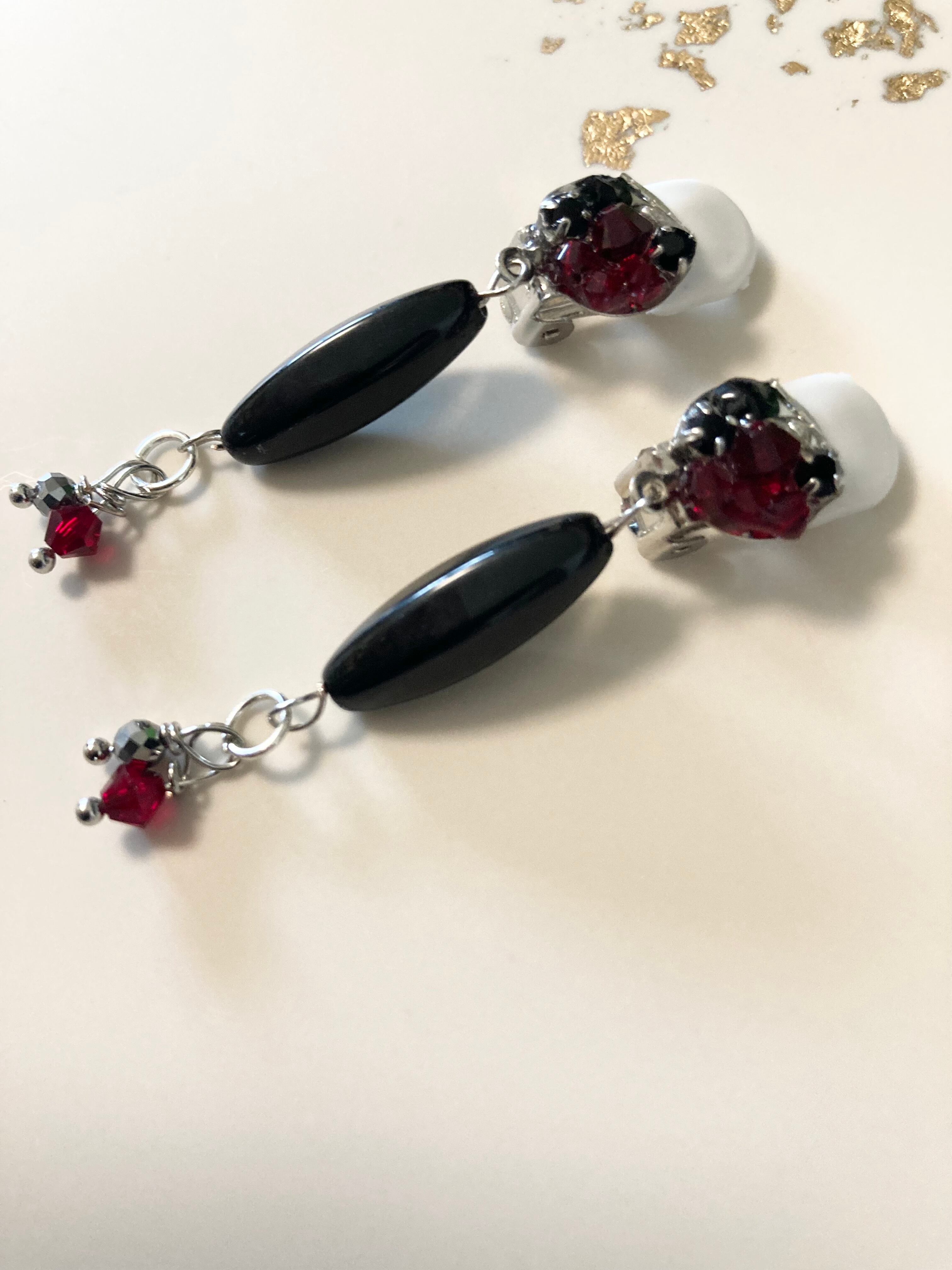 トランプのジョーカーをイメージしたイヤリングです。赤と黒のビーズを使い、遊び心のあるデザインに仕上げました。