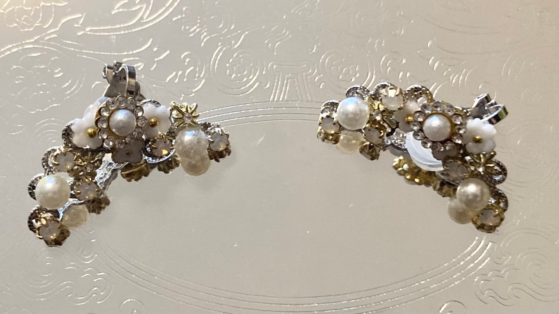 パールのお花を中心に3種類の異素材のお花のモチーフを使い、クリスタルガラス、金色のお星、パールで可愛らしい「白」をぎゅっと集めました。