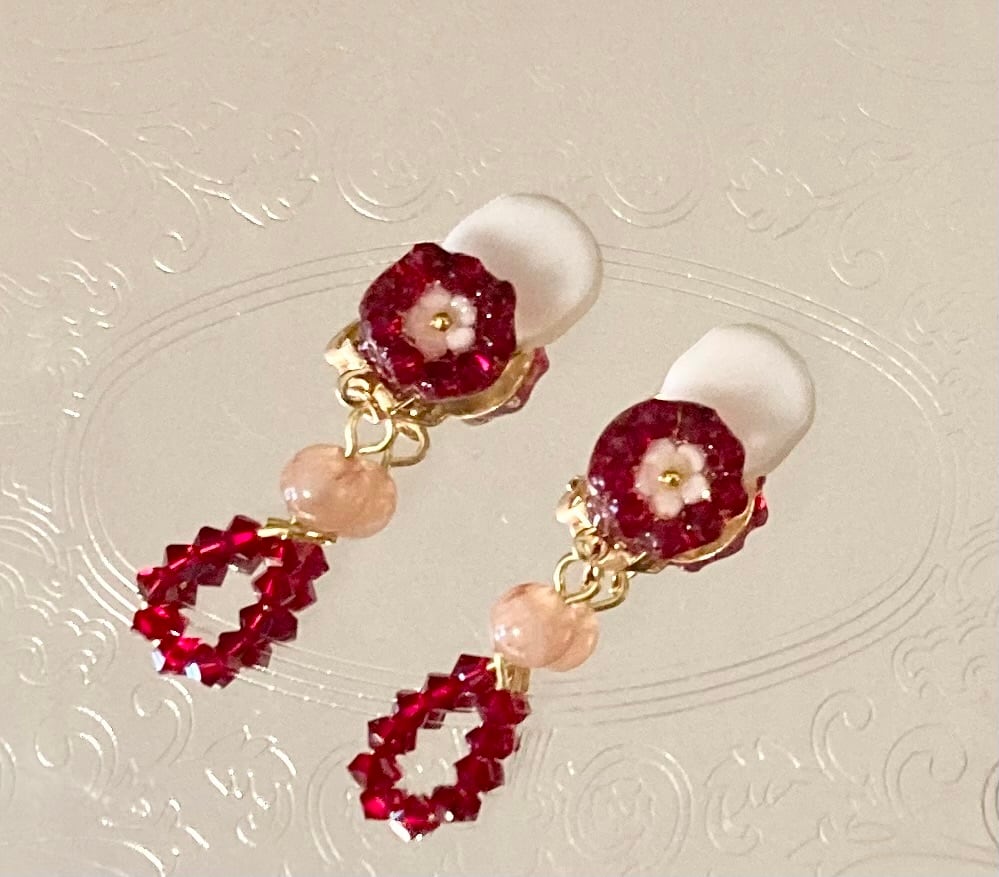 ピンク色の可愛らしい桜を赤色のクリスタルガラスで贅沢に囲みました。ゆらゆら揺れる涙型のクリスタルガラスの上にはピンクアベンチュリンが優しく光ります。