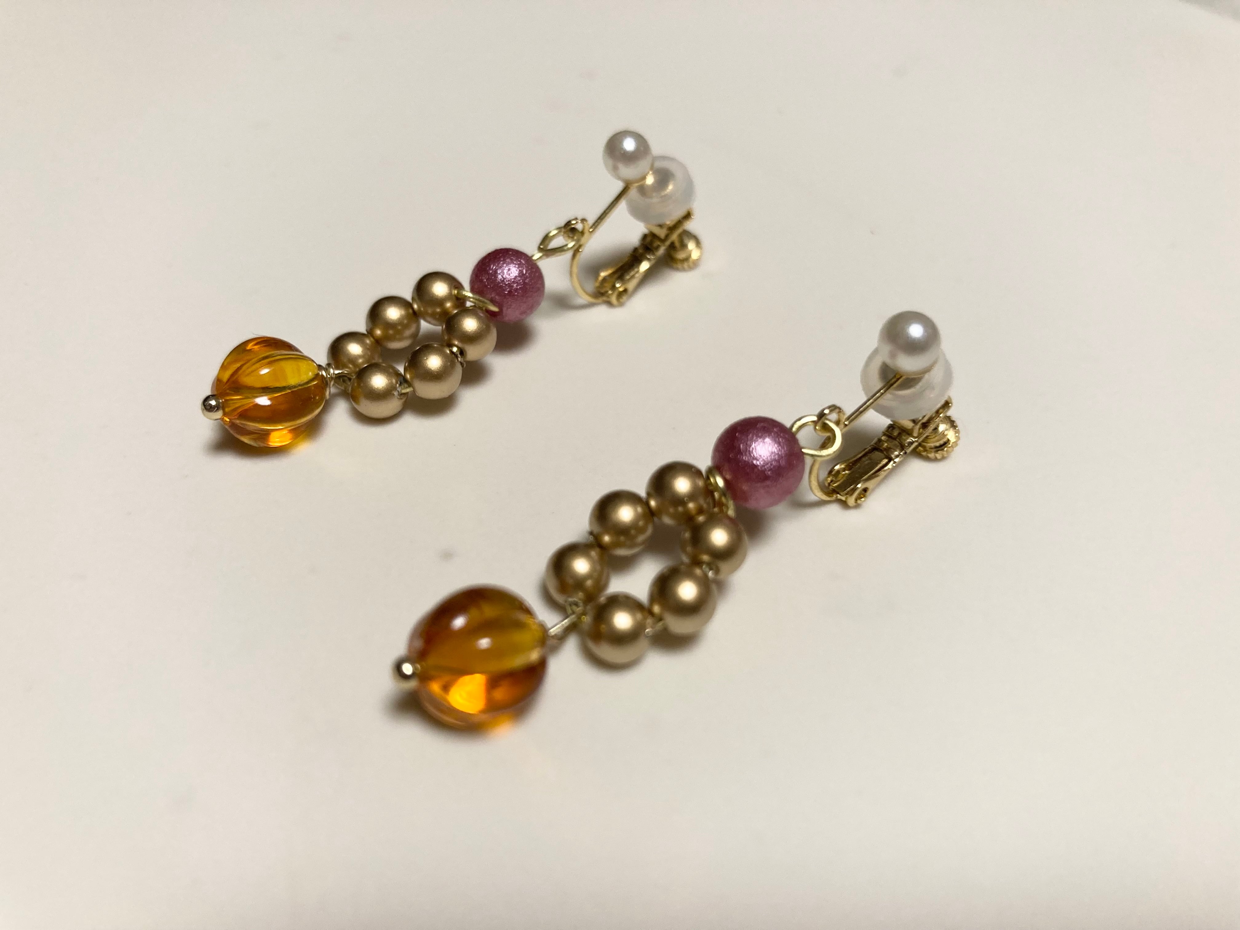 お日様のような暖かみを感じられる優しい色合いのイヤリングです。長時間つけていても痛くなりにくい様に、素材や軽さにもこだわりました。